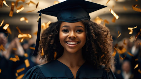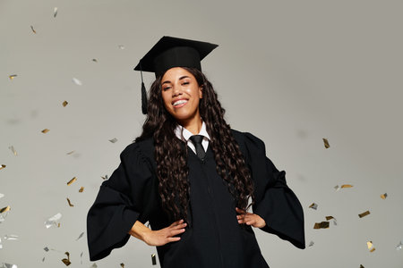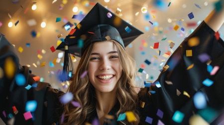 A young woman in graduation attire smiles joyfully as confetti falls around her.