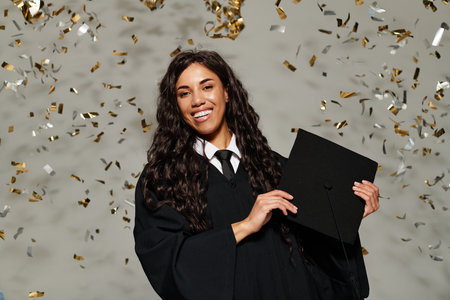 Young woman in graduation cap and gown smiles brightly as confetti falls around her in a studio.