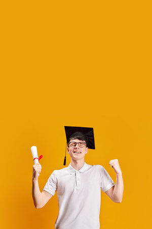 Graduation Day Triumph. Happy young man in graduation cap, holing diploma, celebrating against bright yellow background