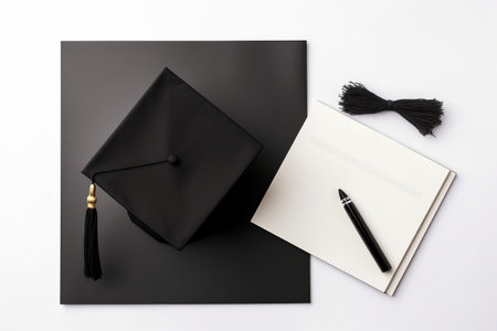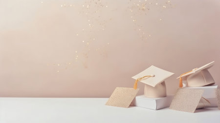 Celebratory graduation scene black cap on white books with colorful confetti background