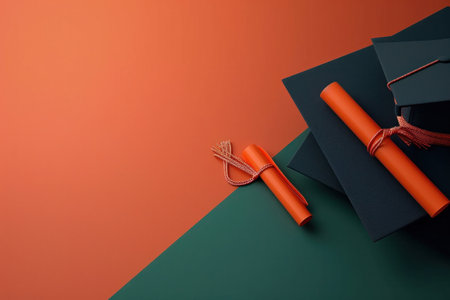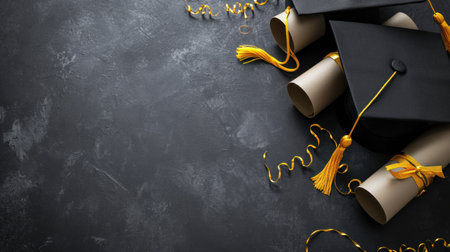 Top view of graduation cap, hat with degree paper certificate graduation on dark background, education concept