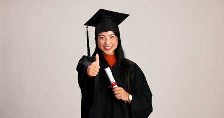 Thumbs up, graduation and diploma with portrait of asian woman in studio for success, college degree or award. Achievement, education and university student with person on white background for mockup