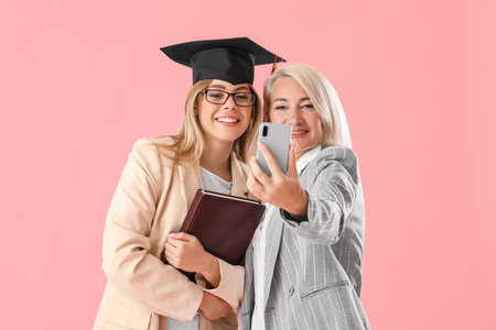 Happy female graduation student with her mother taking selfie on color background