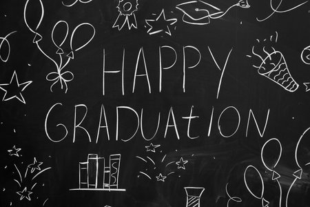 Text HAPPY GRADUATION with drawings on blackboard