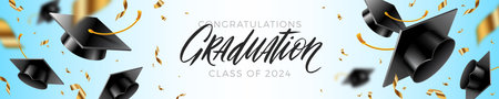 Banner with graduation caps thrown up and golden foil confetti on a blue background. Congrats Graduates. Horizontal vector illustration.