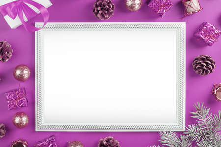 Photo frame and Christmas decorations on color background. Copy space for the text. Template for Christmas greeting card. Merry Christmas and Happy New Year