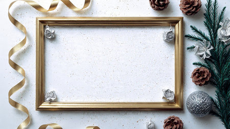 A soft, bright holiday frame enriched with pine and metallic details arranged neatly along the edges.