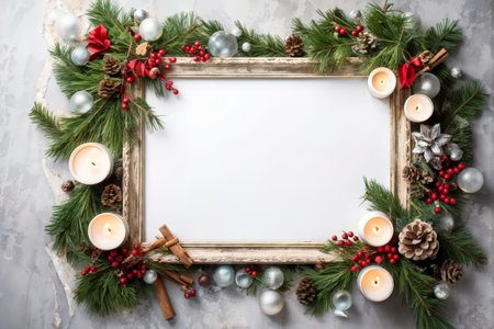 A decorative wooden frame with white space is embellished with holiday decorations such as pine cones, red berries, candles, cinnamon sticks, Christmas ornaments in silver and blue
