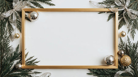 Luxurious Christmas greenery paired with metallic ornaments forming a stunning frame.