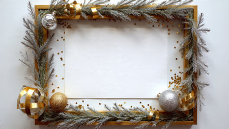 A bright and elegant holiday frame combining pine and glitter ornaments around a white space.