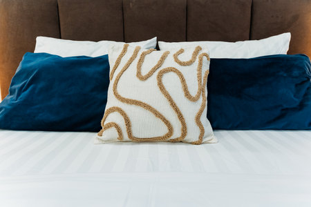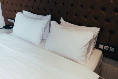 Bed with clean white pillows and scatter cushion in hotel room. Close-up.
