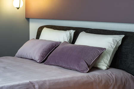 Close-up of soft pillows on cozy bed. Stylish lamp. Modern interior of bedroom in apartment.