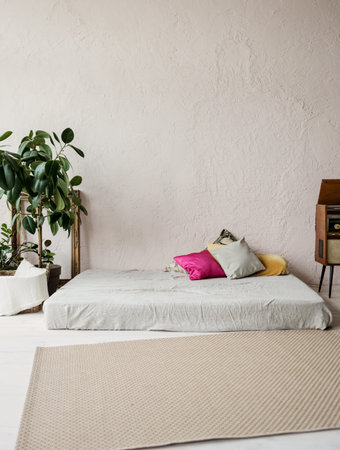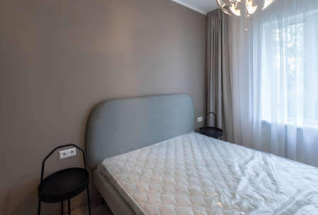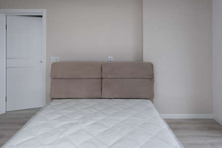Modern interior. Bedroom in apartment. Beige wall. New mattress on bed