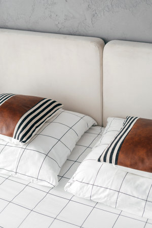 A cozy bedroom features a soft white headboard on bed adorned with stylish black and brown striped pillows, complemented by a minimalist checkered bedspread, creating a serene morning in hotel room