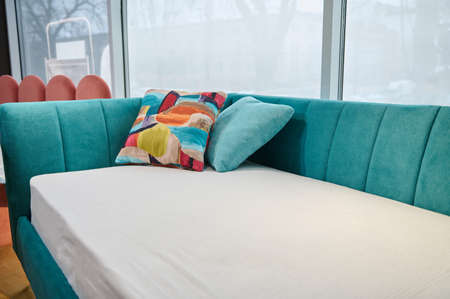 Close-up. Modern stylish and minimalist children's sofa bed with soft bright turquoise velour fabric, on display for sale in the showroom of the highest quality furniture store
