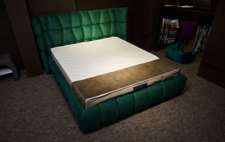 Comfortable stylish green soft bed with orthopedic mattress, displayed for sale in a furniture design showroom against a stand with upholstery fabric swatches. Bedroom and home interior design