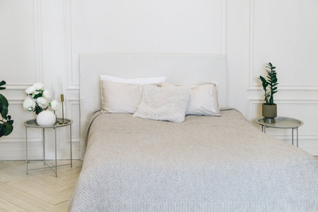 Contemporary Bed dressed with pastel colored cushions and handing lamp.Vase with spring flowers standing on white sidetable.bright bedroom interior. Comfortable bed with coverlet and striped pillows.