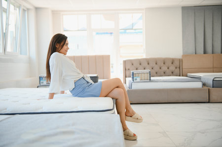 Flat lay of woman hand pressing on white orthopedic mattress with memory foam. Female checking hardness and softness. Choice of the best type and quality
