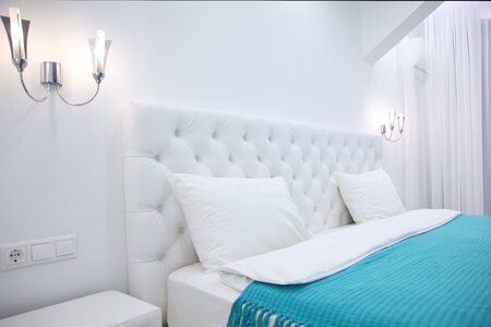 White and blue spacious bedroom with a large bed, in the Scandinavian style. Mockup and free space for text and pictures
