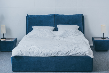 modern interior design of bedroom with bedside tables, lamps and bed with white bedding
