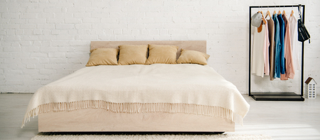 Panoramic photo of rustic bedroom interior with cozy bed and metal nightstand with plant and coffee