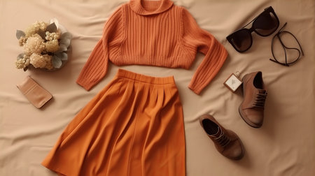 Set of stylish clothes,woman trendy fashion clothes collage on beige, flat lay, top view. Al generated illustration
