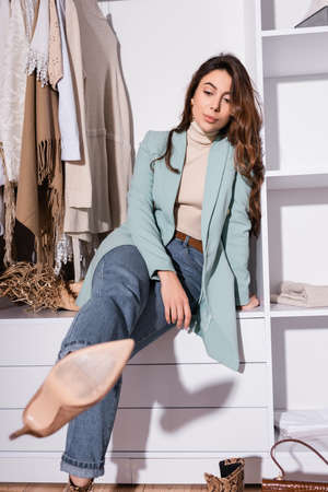 Brunette woman looking at heeled shoe on blurred foreground in wardrobe
