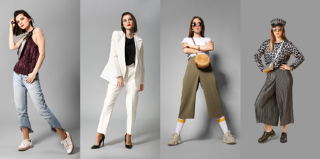 Collage of different fashionable young women on gray background