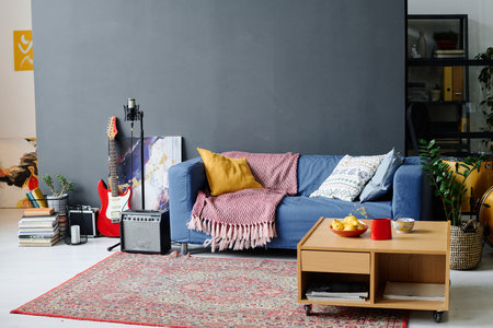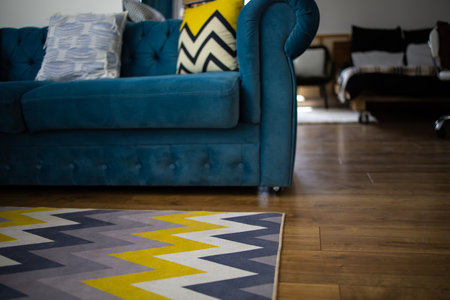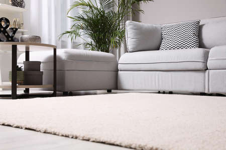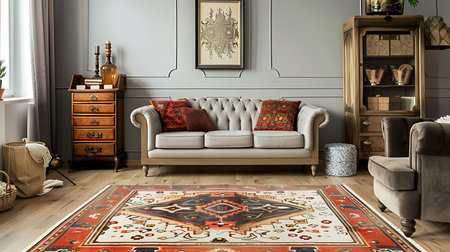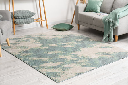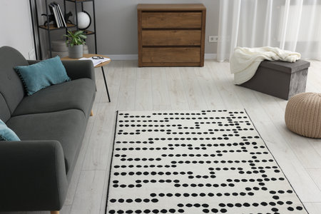 Interior of modern living room with sofa, beautiful rug, armchair and chest of drawers indoors