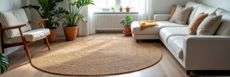 Cozy modern living room with round jute rug and indoor plants by a window. That the image is generated using AI.