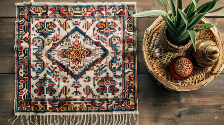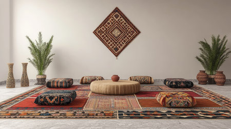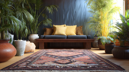 Discover a cozy interior featuring vibrant rugs and comfortable cushions, complemented by greenery and pottery. Perfect for serene living spaces.