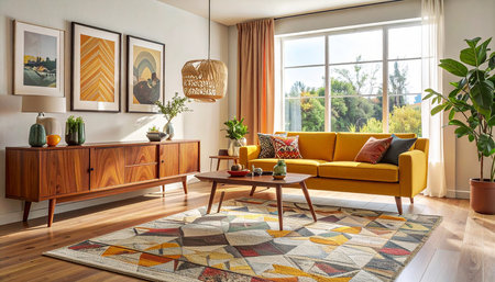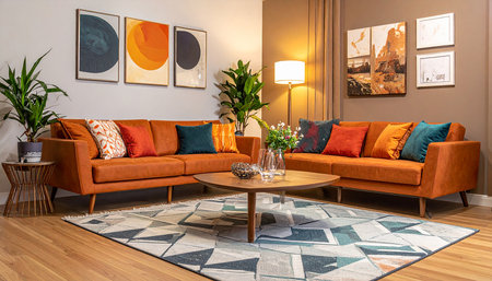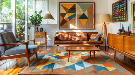 Stylish living room showcases a brown leather sofa, geometric artwork, wooden furniture, and a colorful area rug, creating a cozy and inviting space for relaxation and comfort, AI generated