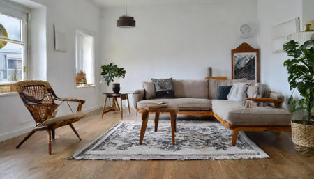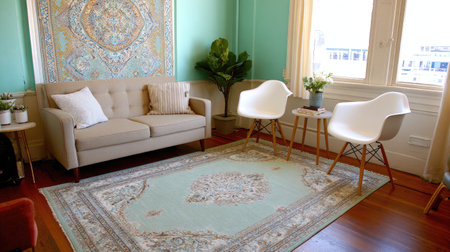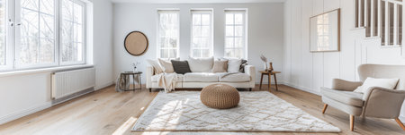 An interior shot features a living room with a neutral-toned sofa, paired with white chairs and small tables. A patterned rug and a decorative wall hanging add visual interest. Natural light streams in through the windows. The room's design lends itself well to uses in home decor advertising and lifestyle content.