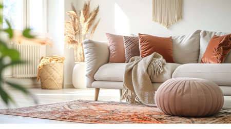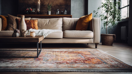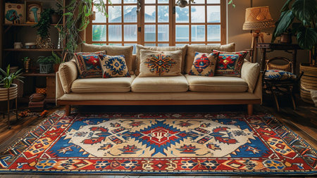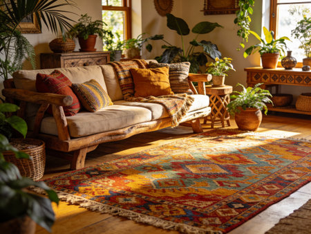 bohemian atmosphere with rugs, colorful cushions and potted plants around the sofa and table. generative ai