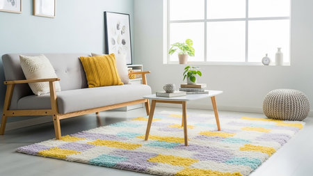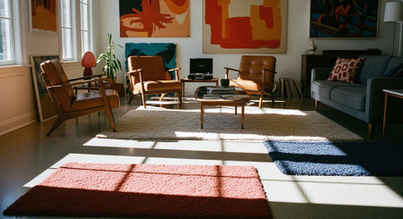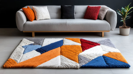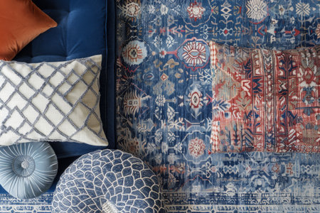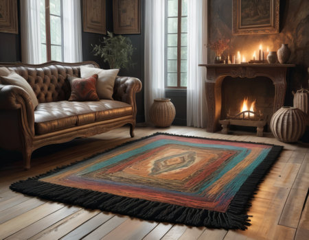 A collection of colorful and patterned rugs displayed in a room, adding warmth and style to the space, Mix and match patterns and textures to create a unique look, AI generated