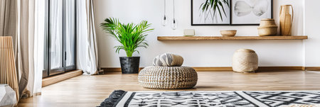 Minimalist living room composition with zen elements in a Scandinavian apartment