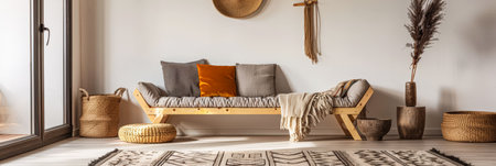 Residential interiors design composition in warm tone with natural window lighting, stylish furniture and copy space. Rustic Real Estate advertising composition.