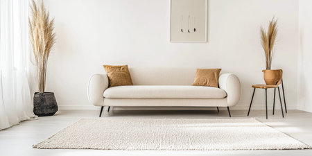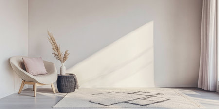 Minimalist living room interiors with neutral tones and elegant simplicity. Residential interior design composition with copyspace.