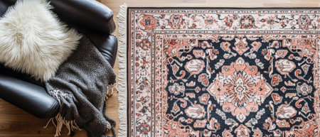 A warm and inviting living room showcases a beautifully designed area rug on wooden flooring. The cozy seating includes a plush black chair adorned with a soft throw blanket and a decorative pillow.