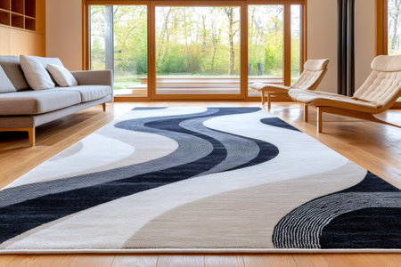 Elegant rug with a wavy pattern placed in a bright living room with a view of the garden