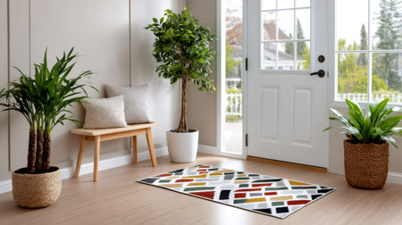 Entryway welcoming guests with green plants, wooden bench, and geometric patterned rug