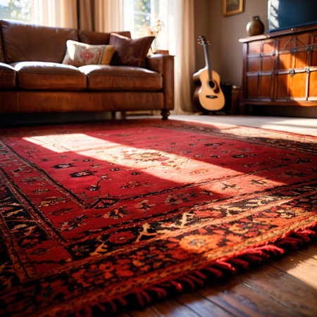 Warm sunlight illuminating a beautiful patterned rug indoors