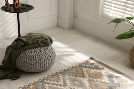 Stylish knitted pouf with plaid and home decor indoors. Space for text