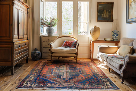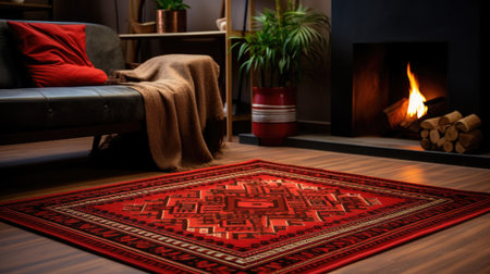 Classic interior: Enhance your vintage decor with a traditional Arabian red rug, woven with intricate motifs and timeless cultural charm.