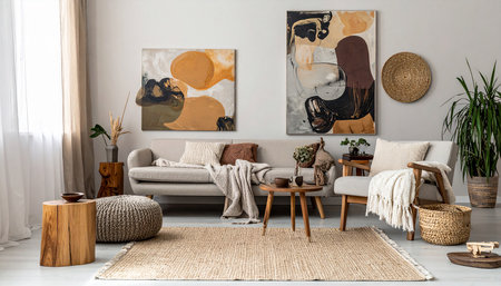 Modern bohemian living room interior. Colorful rugs and cushions, rattan furniture, and a mix of vibrant patterns. White walls adorned with macrame hangings and shelves filled with eclectic decor items. Large indoor plants add a touch of greenery.