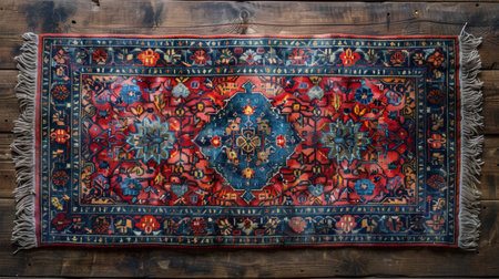 Magic carpet with bold patterns and intricate borders on floor. Copy space