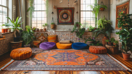 bohemian home decor, create a bohemian living space with a combination of colorful tapestries, comfy floor cushions, and lush potted plants for a cozy and artsy atmosphere