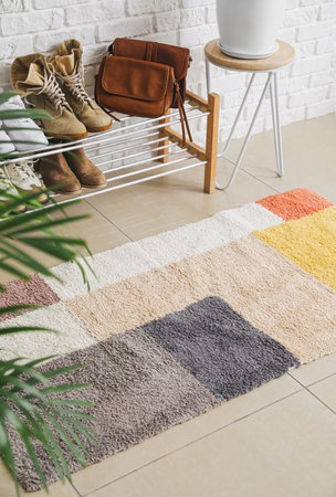 Textured two-tone rug with contrasting colors and unique patterns enhances the interior space