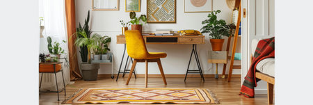 Cozy modern home office with a bohemian vibe. Wooden desk, colorful chair, and eclectic wall art. Potted plants, natural light, and warm textiles.