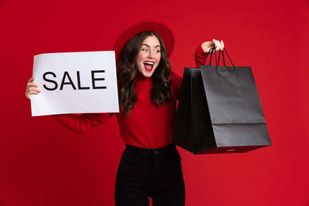 White woman smiling while posing with shopping bags and sale placard isolated over red background